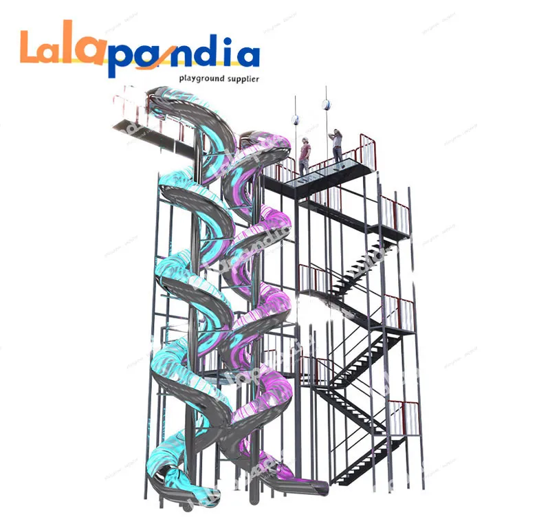 Lalapandia's big stainless steel tube slide with LED, ideal for indoor play centres, is a standout indoor play slide featuring closed and open stainless steel flumes, boasts dual vibrant spiral soft - play slides with a multi - level metal framework, meeting global safety standards and customizable for your space.