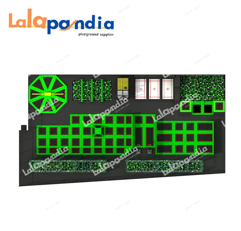 Recreation elements: rope net, tunnel, trampoline, carousel, slide, ball pool, rocking horse, Rotating slide