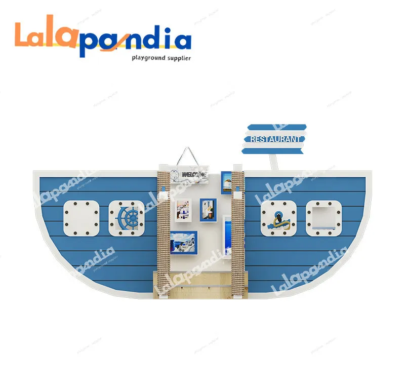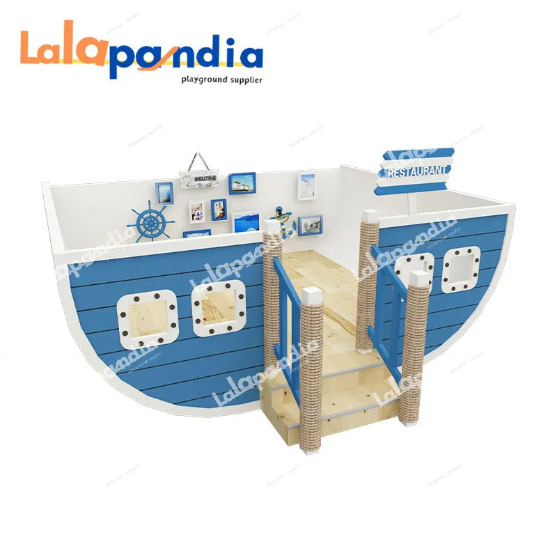 Boat - shaped pretend play house, with a marine theme, has rich nautical elements setup to inspire kids' role - playing and imagination. Made of safe materials and featuring interactive designs like stairs, it ensures safety and enhances children's social and creative skills, perfect for indoor play.