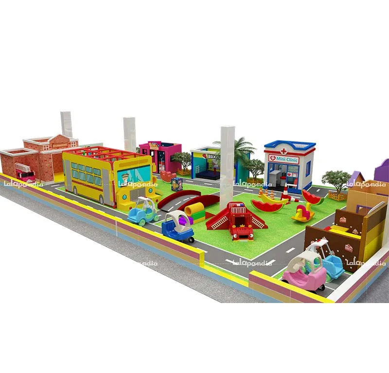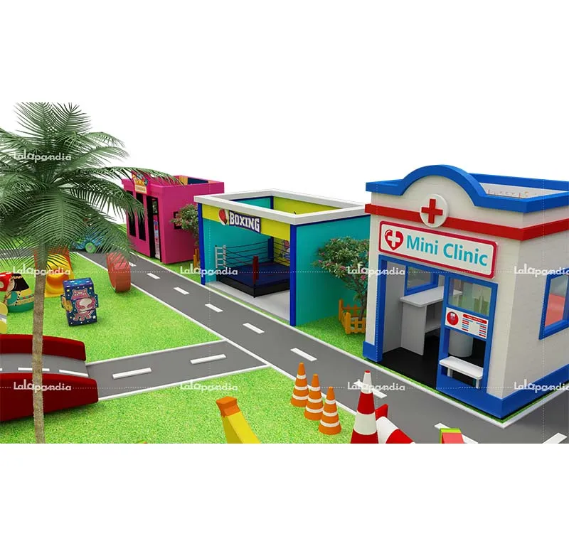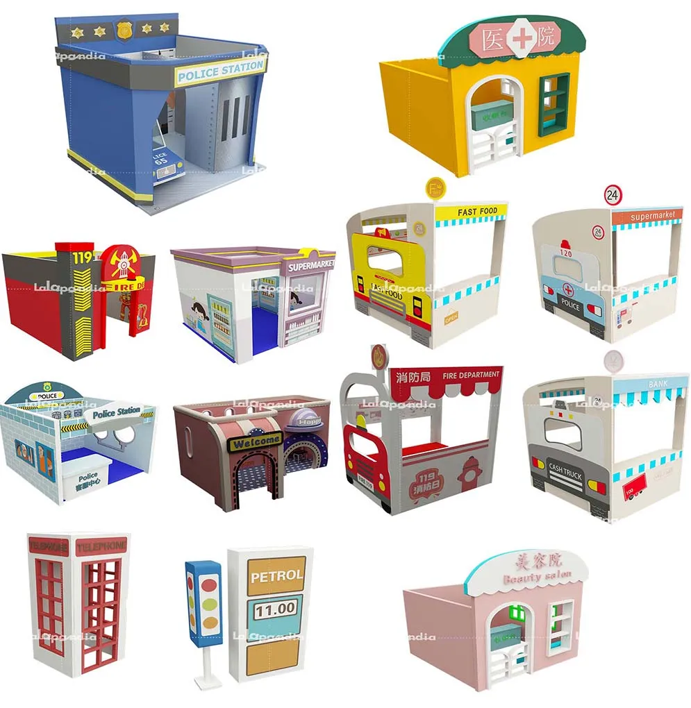Large-scale commercial role-play house: Modular design, customizable themes, and equipped with slides and climbing nets. Compliant with ASTM/EN1176 standards, it offers a variety of role-playing experiences to stimulate children's imaginations and is suitable for family entertainment centers and shopping malls.