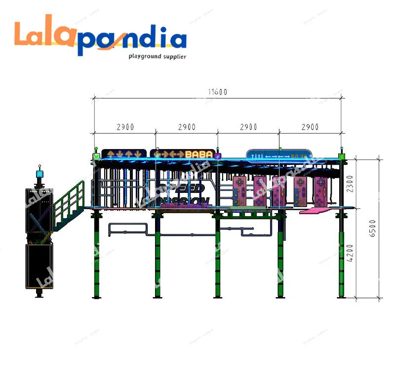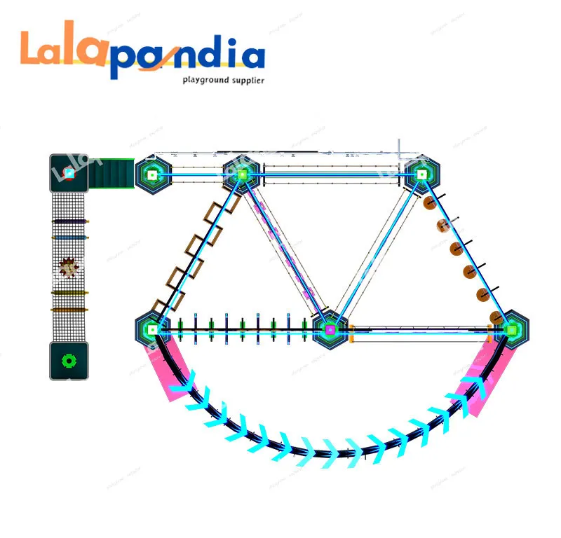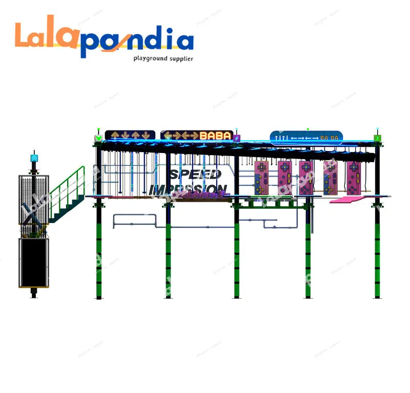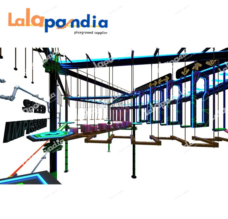 Commercial customizable indoor rope course, integrating high ropes challenges and indoor rock climbing, features diverse obstacle layouts, vibrant neon lighting, and modular design, equipped with tight ropes, zip lines, suspended platforms and other diverse facilities, suitable for shopping malls, parks, and playgrounds.